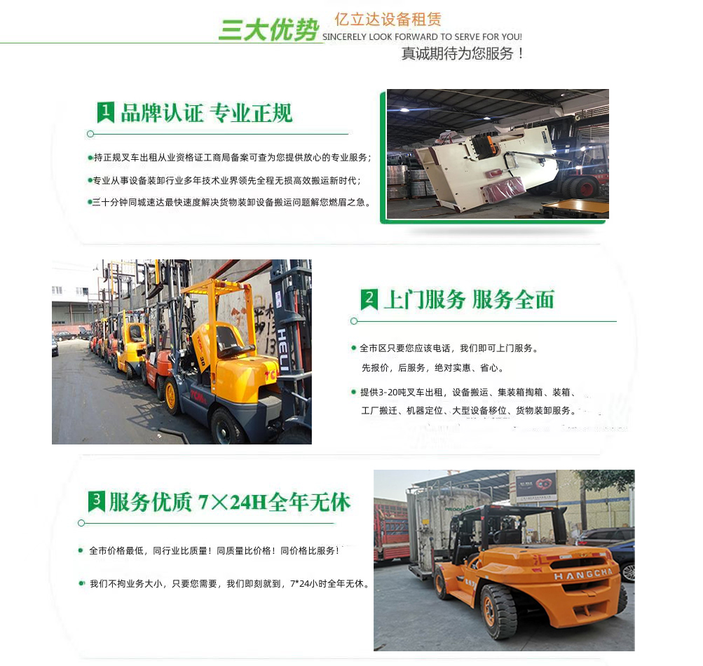 亿立达设备租赁有限公司是工商局准许的天津医学高等专科学校专业叉车出租公司,公司本着诚信、服务、效率、创新的经营理念,用精湛的技术,真诚的服务,为众多客户提供优质的服务,同时获得信赖与支持。专业提供天津医学高等专科学校3-20吨叉车出租、叉车租赁、设备搬运、集装箱掏箱装箱、机器移位定位、货物装卸、工厂搬迁、安全可靠,收费透明,价格便宜,随叫随到,24小时上门服务!本公司叉车吊车师傅对各种设备搬运装卸都有深刻探讨和研究。很多的疑难设备搬运,通过我公司的叉车师傅都能迎刃而解。对各种进口设备、国产机器、大型设备搬迁、高难度搬迁、各种精密仪器、医疗设备、科研设备等都能搬运; 提供全市 24 小时上门装卸搬运服务。同时提供厂房搬迁服务。 ...